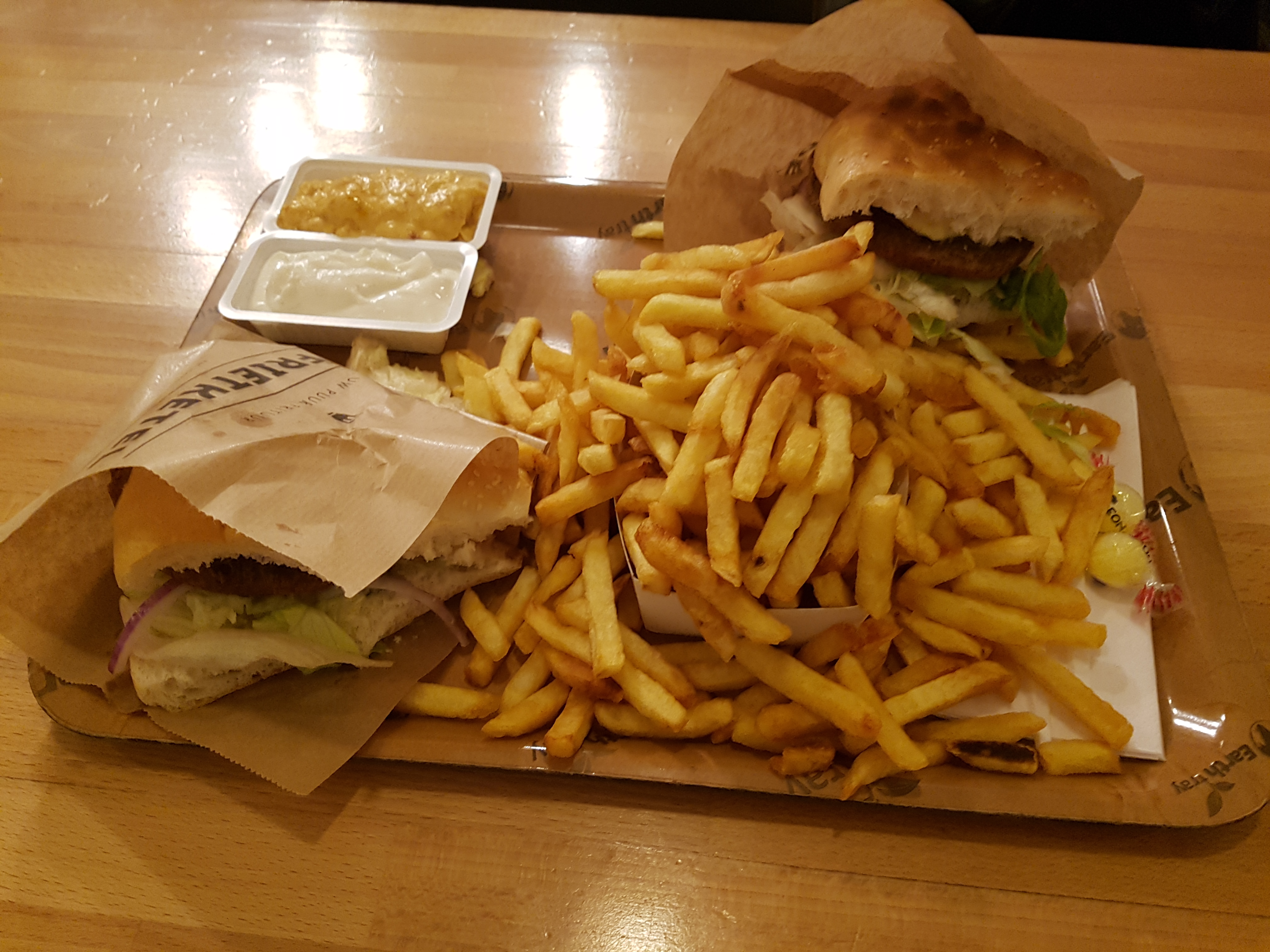 Omdat wij geen tijd zouden hebben voor een uitgebreid diner, besloten wij naar de Frietketel te wandelen. Een cafetaria die vermeld stond op de lijst van de beste vegan hotspots van Gent. Niet het gezondste alternatief, maar na twaalf kilometer wandelen hadden wij wel zin in wat warms. Het menu gaf duidelijk aan waarom ze op de lijst met beste vegan hotspots staan. Er was een ruime keuze aan vegan burgers en vegan sausjes bij de friet. Al met al hebben wij nog redelijk lang op de bovenverdieping van de cafetaria gezeten. Je had ook wel even de tijd nodig om de gigantische hoeveelheid patat op te eten. Iets wat ons niet is gelukt.