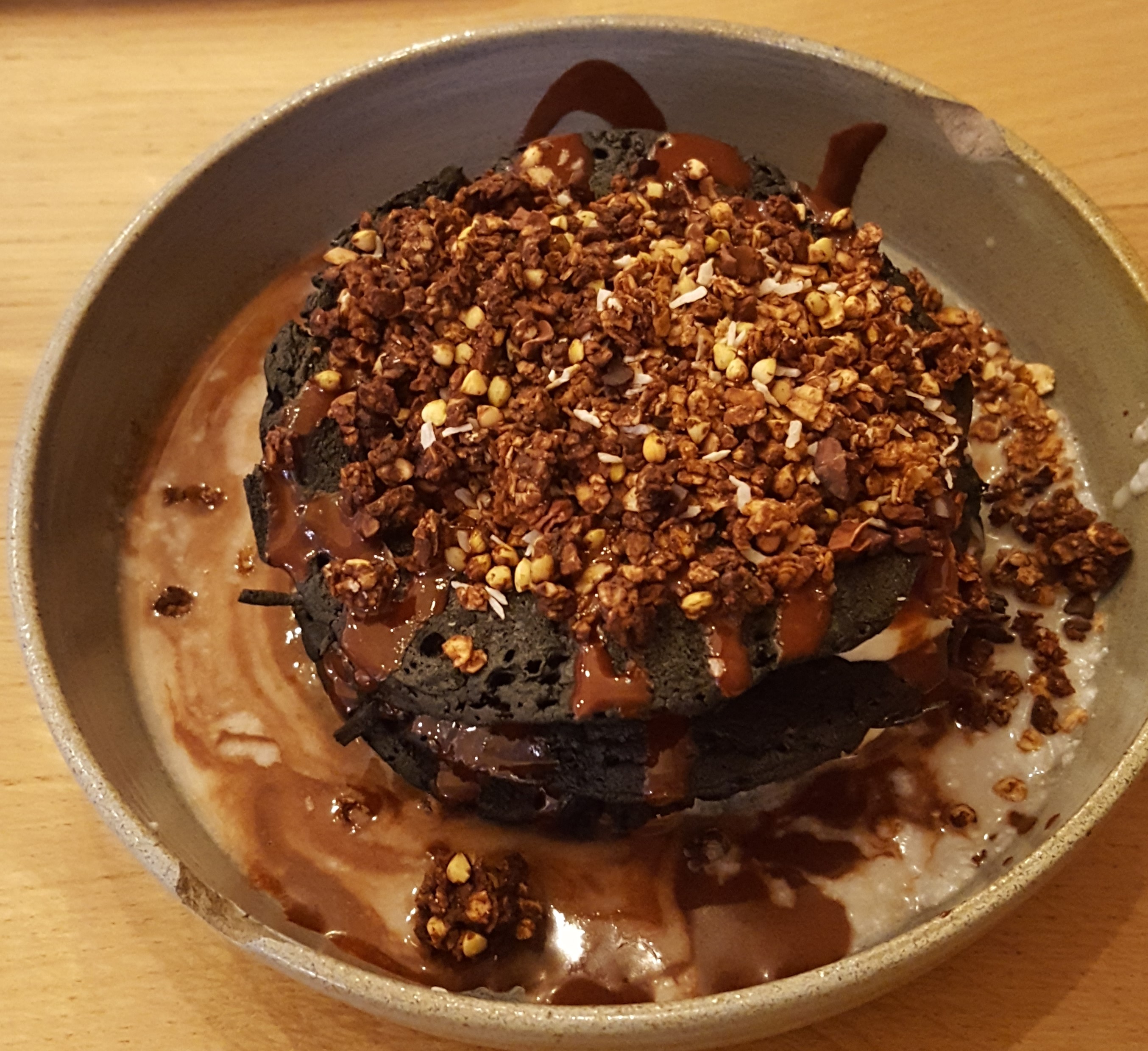 De bowl was best wel stevige kost en vulde goed. Het was een koude dag, dus een warme bowl was voor mij een goede keuze. Als je wilt kun je bij O’yo de bowl uitbreiden met diverse extra toppings. Op de kaart staan nog twee andere veganistische bowls en de toasts zijn allemaal veganistisch. Ik houd niet zo heel erg van pannenkoekjes, maar Saskia liet een stukje over en dus kon ik het niet laten om even te proeven. En ik moet zeggen ze waren verrassend lekker. Niet zo lekker als mijn bowl, maar dat is een persoonlijke keuze. Saskia zal vast de keuze andersom maken.