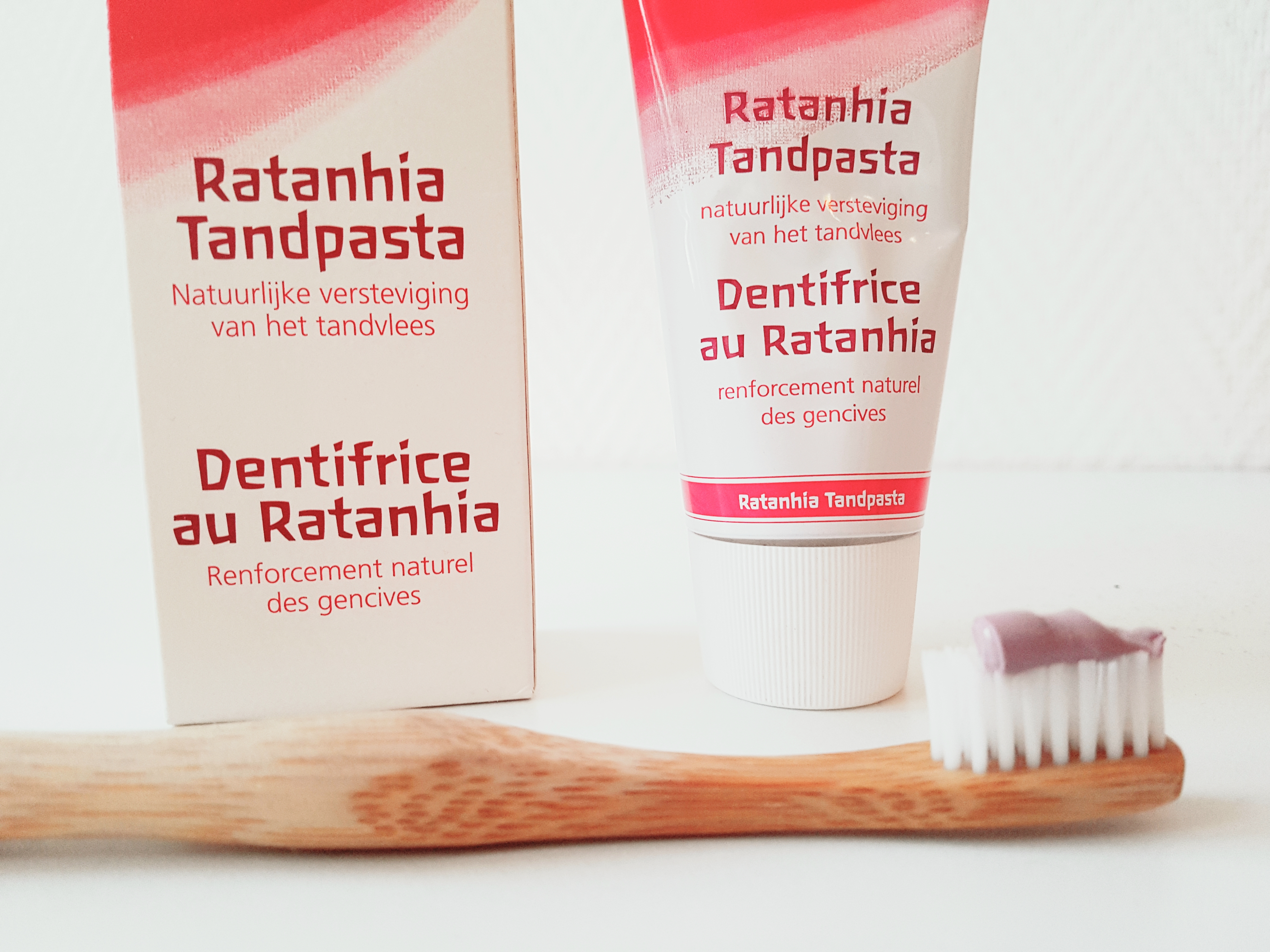Terug naar de tandpasta. Ook in de Ratanhia tandpasta vind je de hier bovengenoemde ingrediënten als water, calciumcarbonaat, glycerine, magnesiumaluminumsilicaat, alcohol, aroma, extract van mirrehars, xanthaan, glycyrrhizinezuur ammoniumzout en limoneen terug.