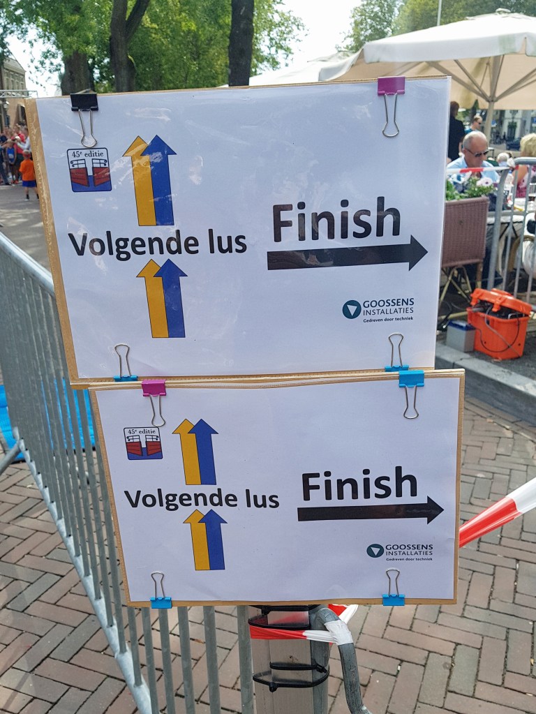 Ongeveer 10 minuten voor de start begon de gezamenlijke warming-up. Beetje heen en weer bewegen, beetje strekken en daar klonk het startschot al. De eerste 200 meter gingen gelijk redelijk straf omhoog de dijk op en bij de Prinses Beatrixsluizen weer naar beneden. Over het industrieterrein De Wiers weer terug naar het startpunt in het oude dorp. Hier zat de eerste 4 kilometer erop. Daarna volgde een lus van ongeveer een kilometer over de Dorpstraat en toen waren wij weer terug bij het startpunt. De lopers die 5 kilometer liepen waren nu klaar. Wij hadden gekozen voor de 10 kilometer en moesten dus nog een keer dezelfde twee rondjes lopen.